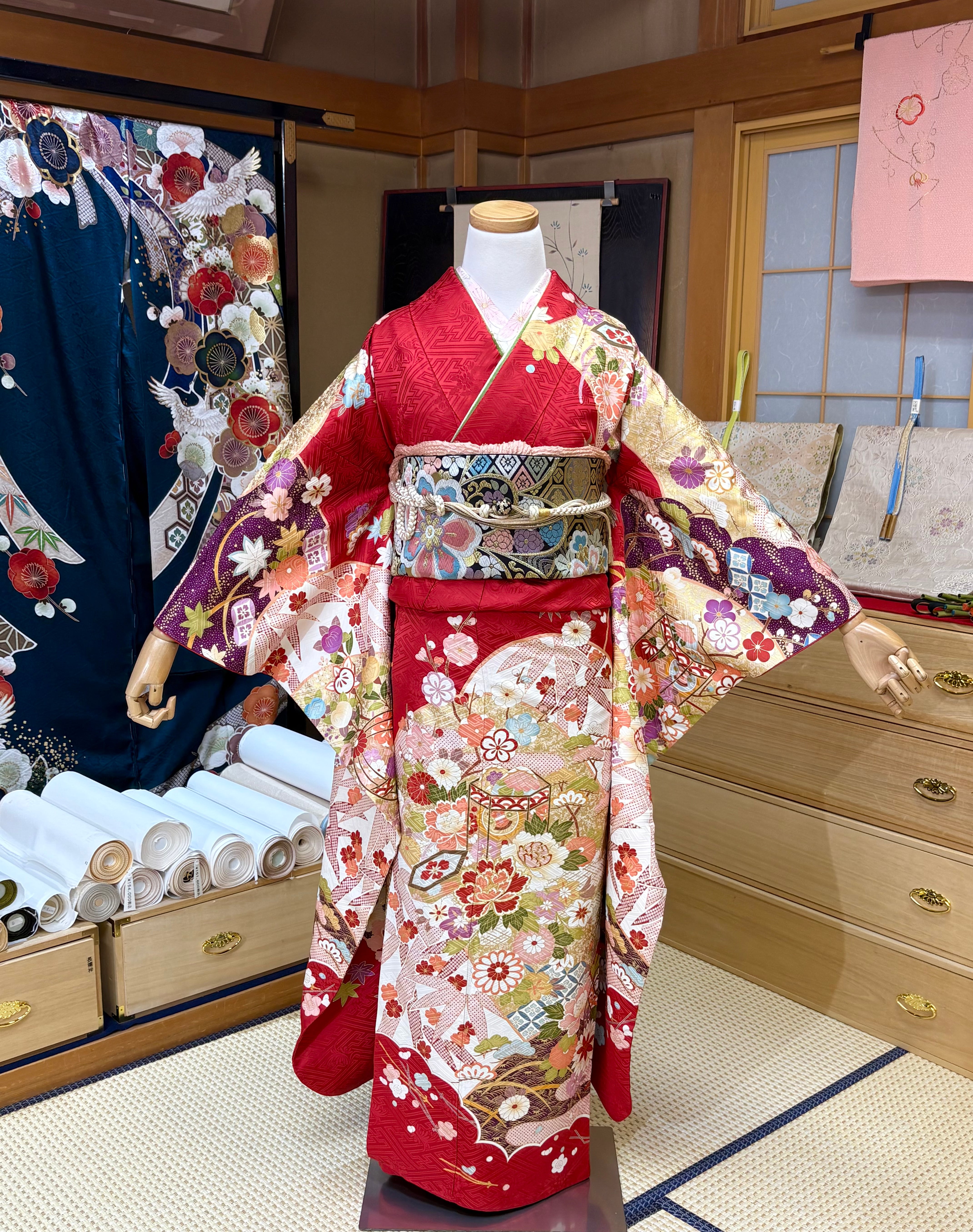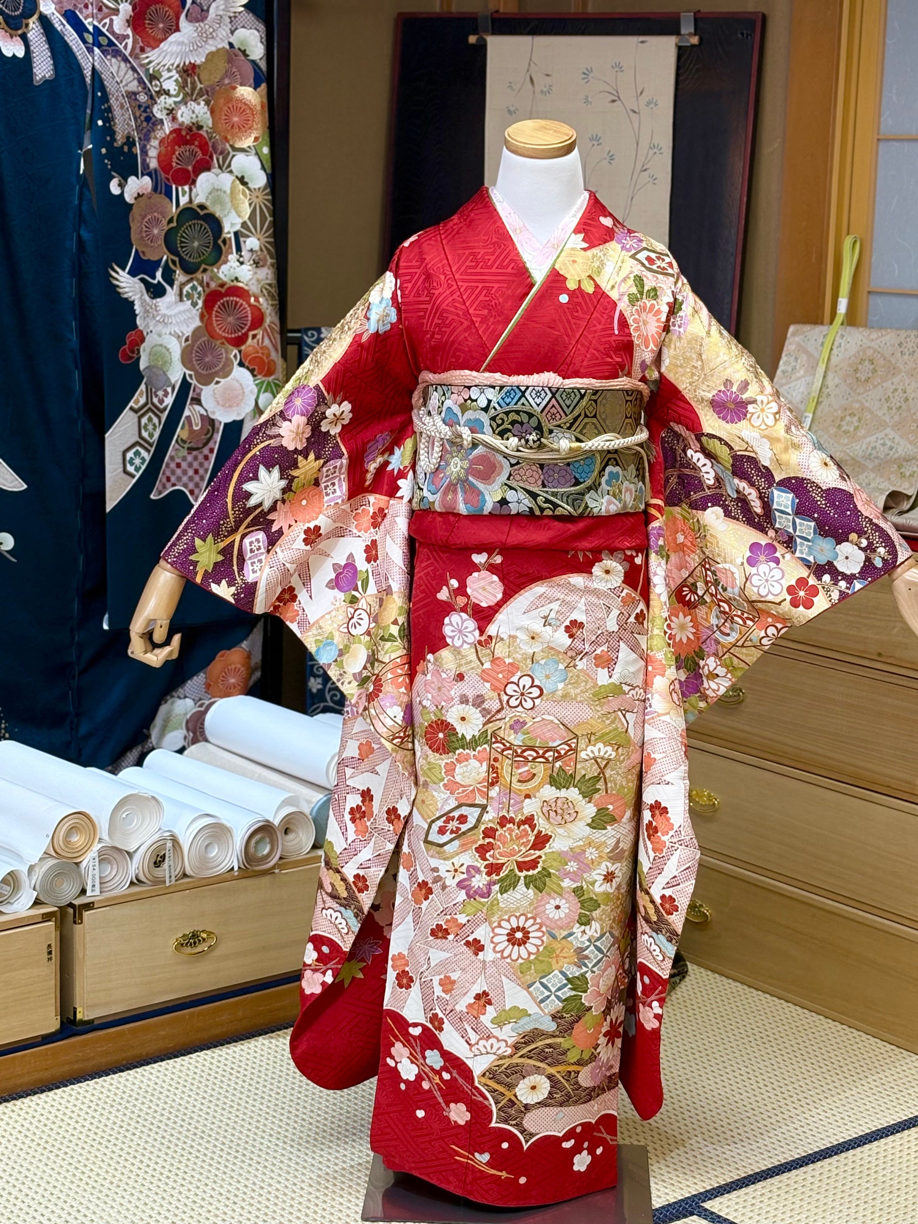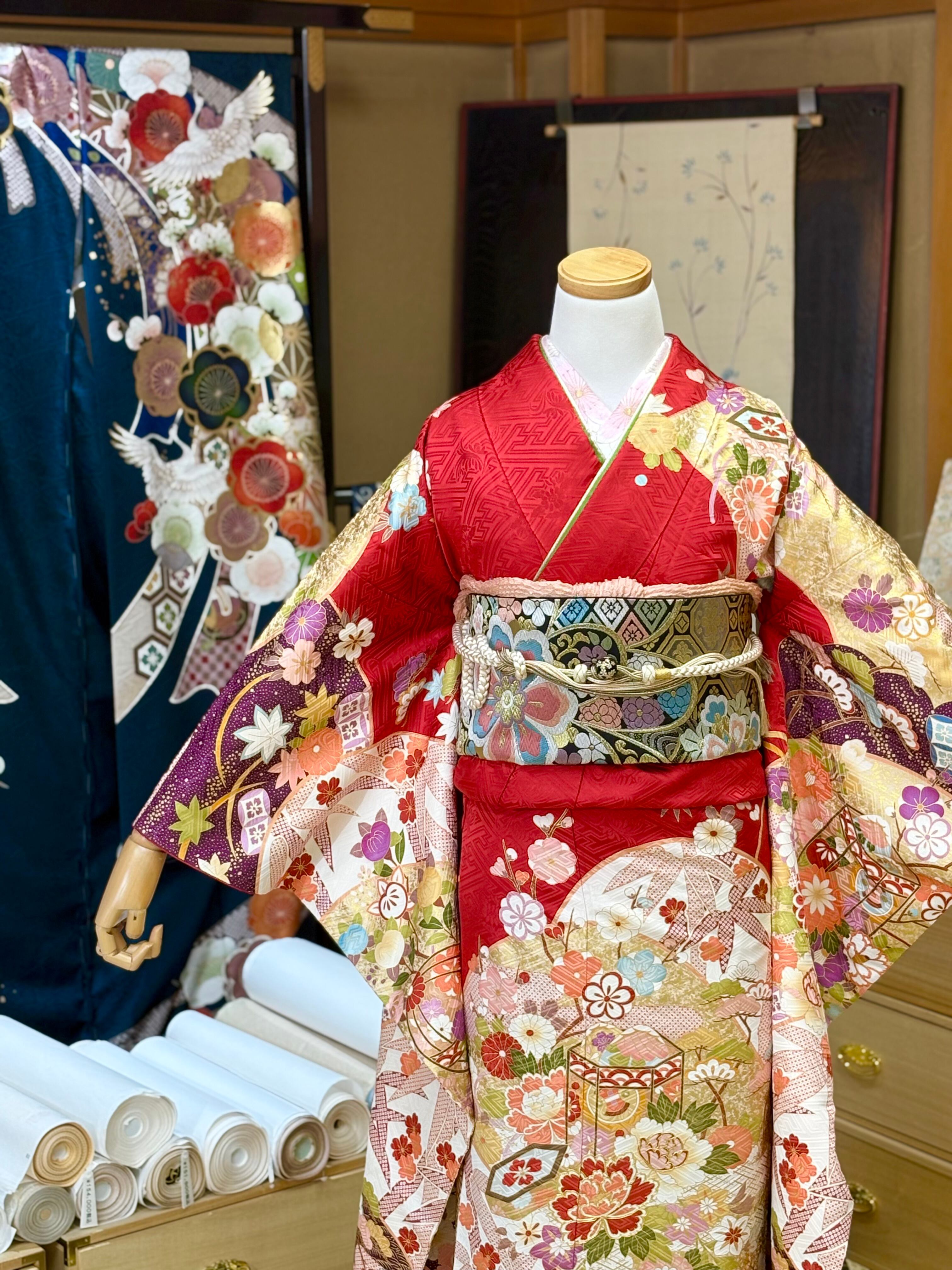 この振袖セットは、成人式をはじめ、結婚式の出席、親族の集まりなど特別なイベントでの使用に最適です。絞り振袖と一緒に素敵な瞬間をぜひお楽しみください。早めのご予約をお勧めいたします。