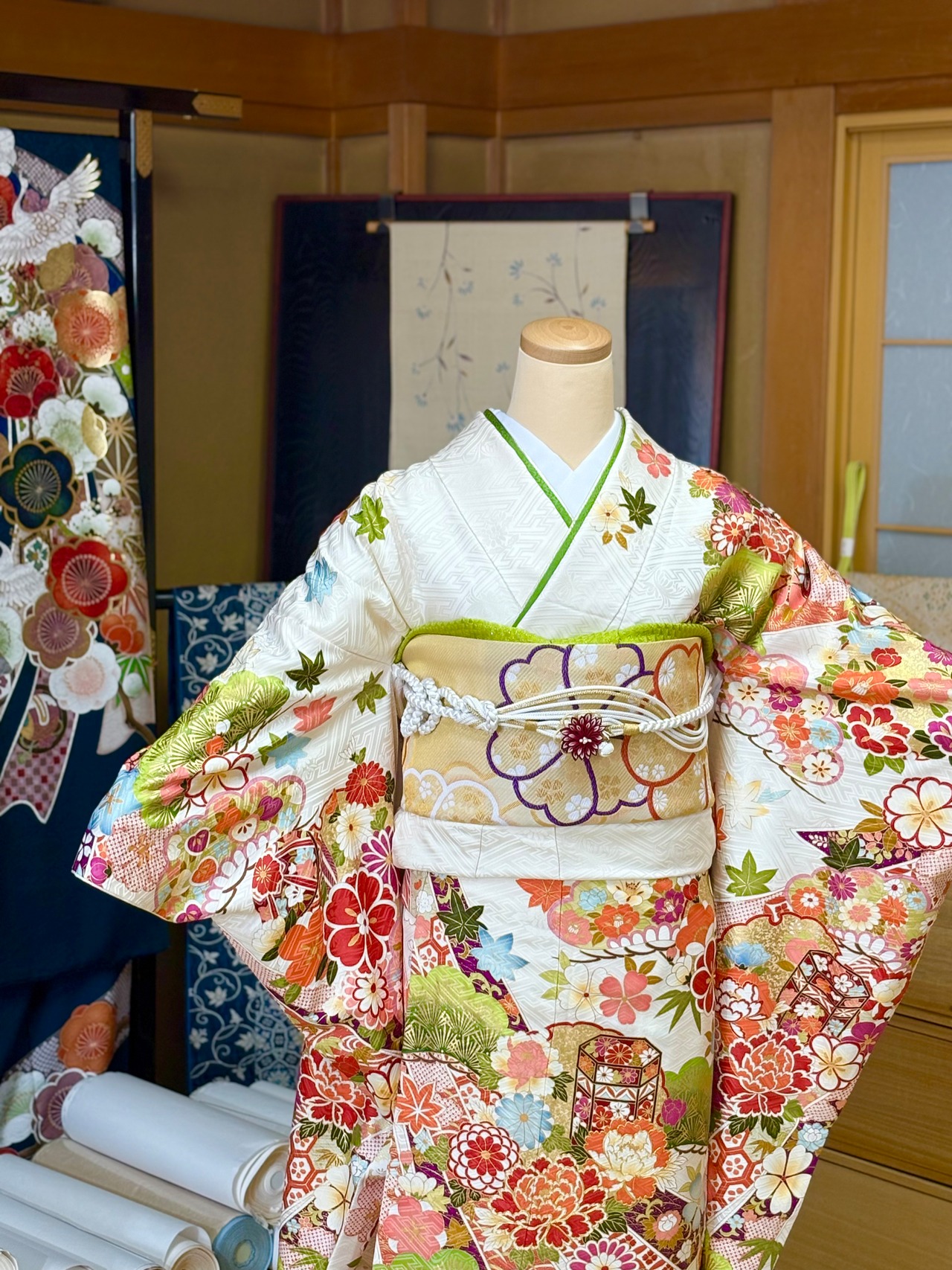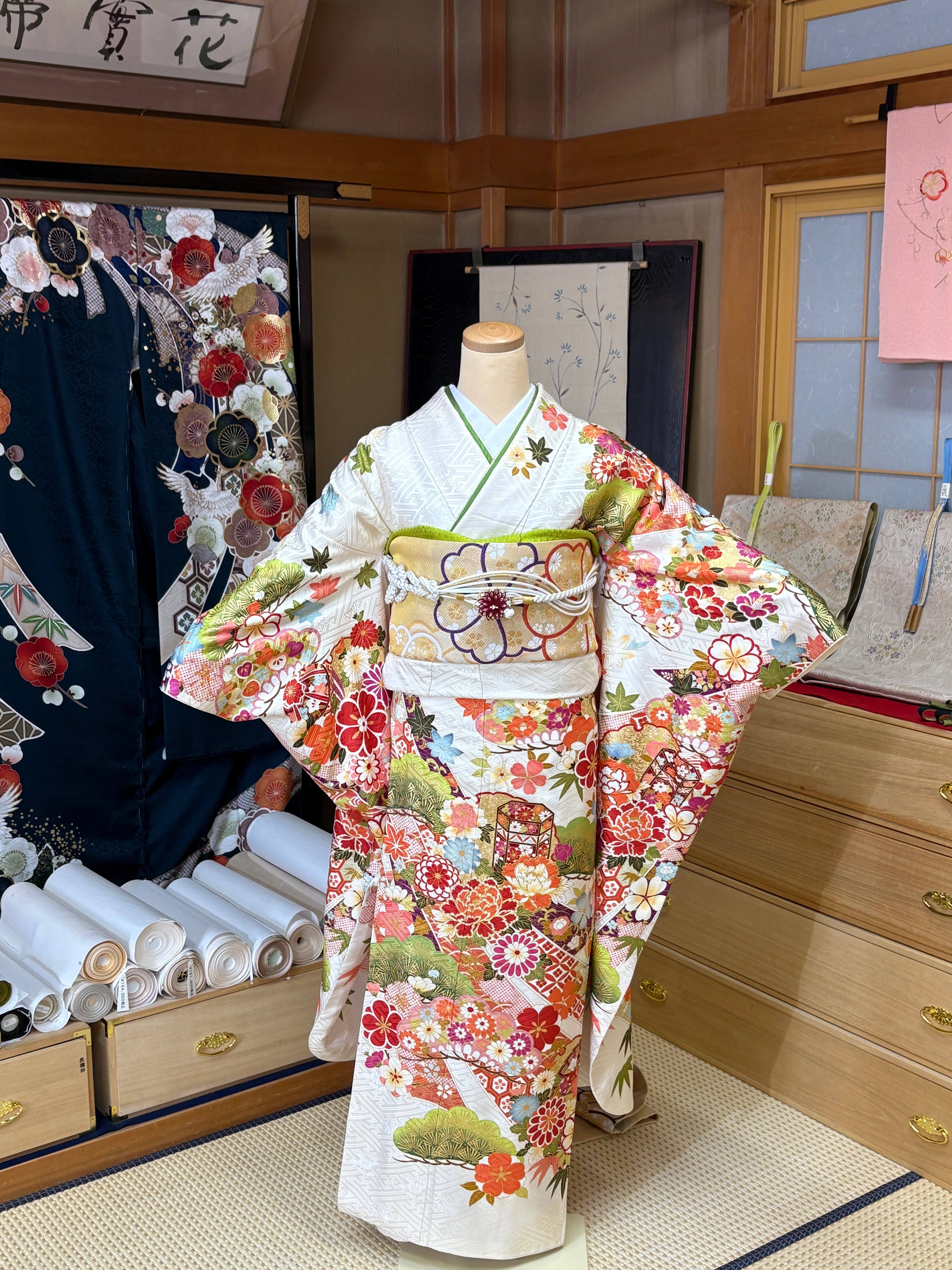 この振袖セットは、成人式をはじめ、結婚式の出席、親族の集まりなど特別なイベントでの使用に最適です。絞り振袖と一緒に素敵な瞬間をぜひお楽しみください。早めのご予約をお勧めいたします。