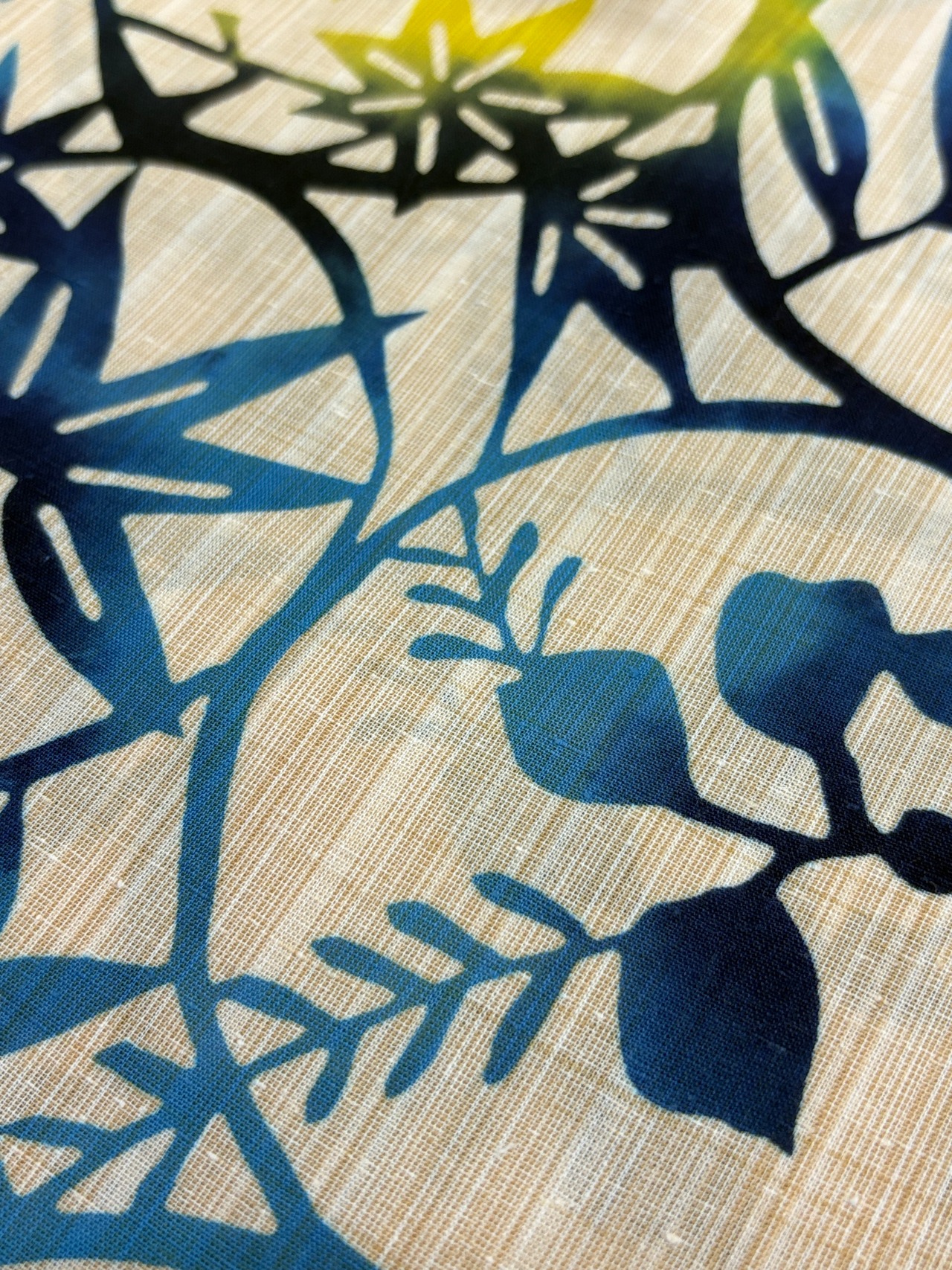 特殊な糊で防染し重ね上げた生地の上から染料注ぎ、