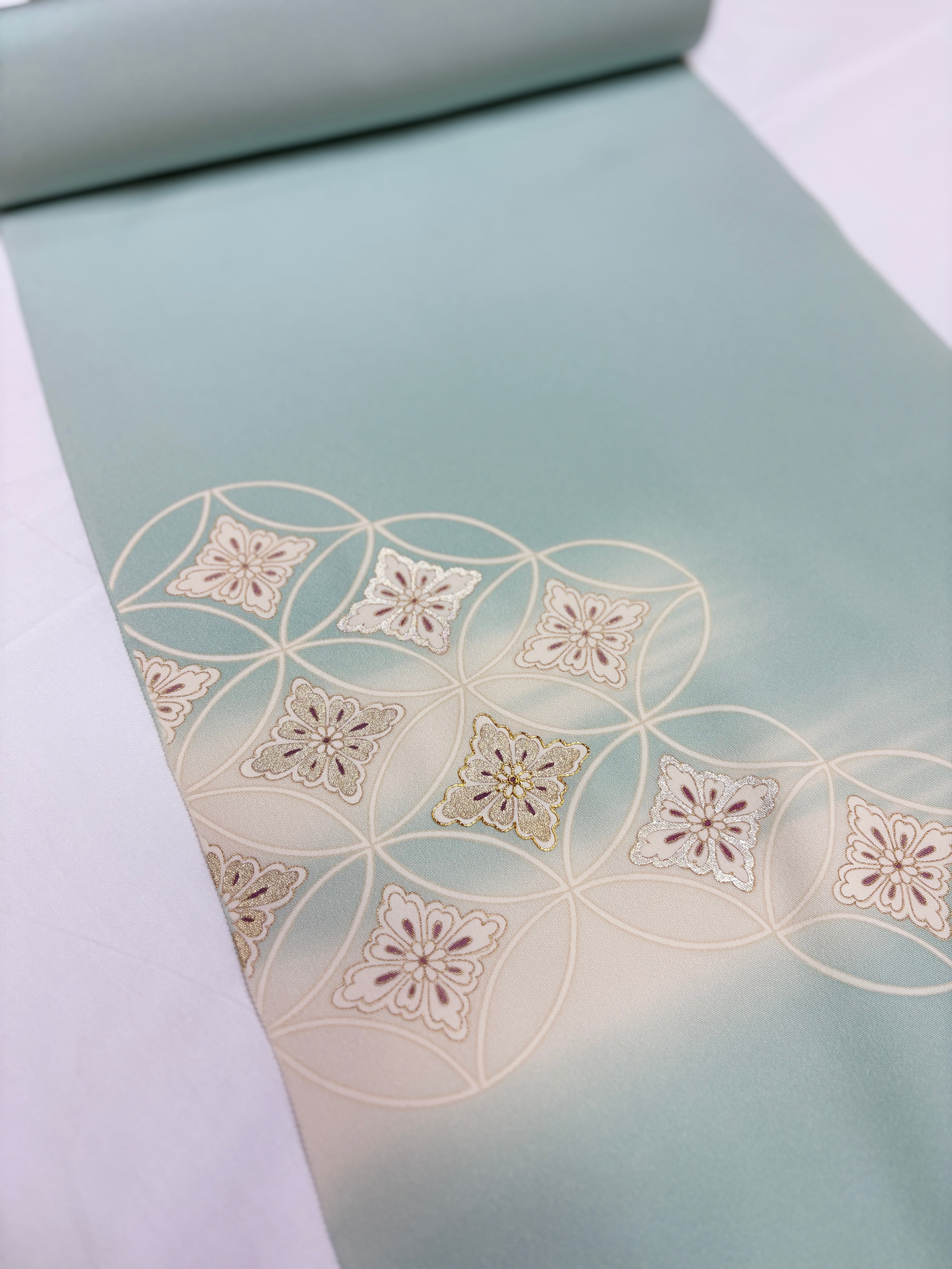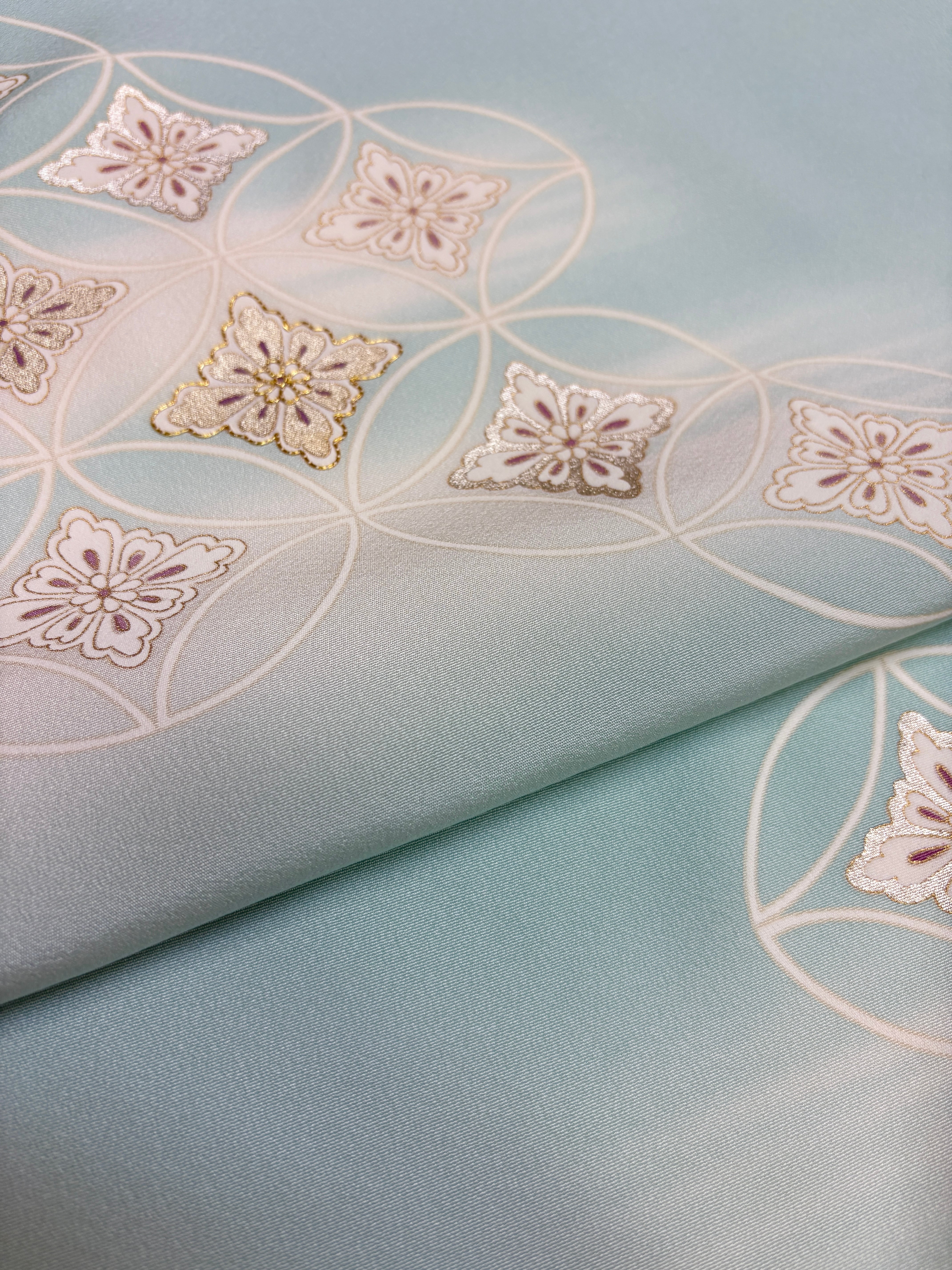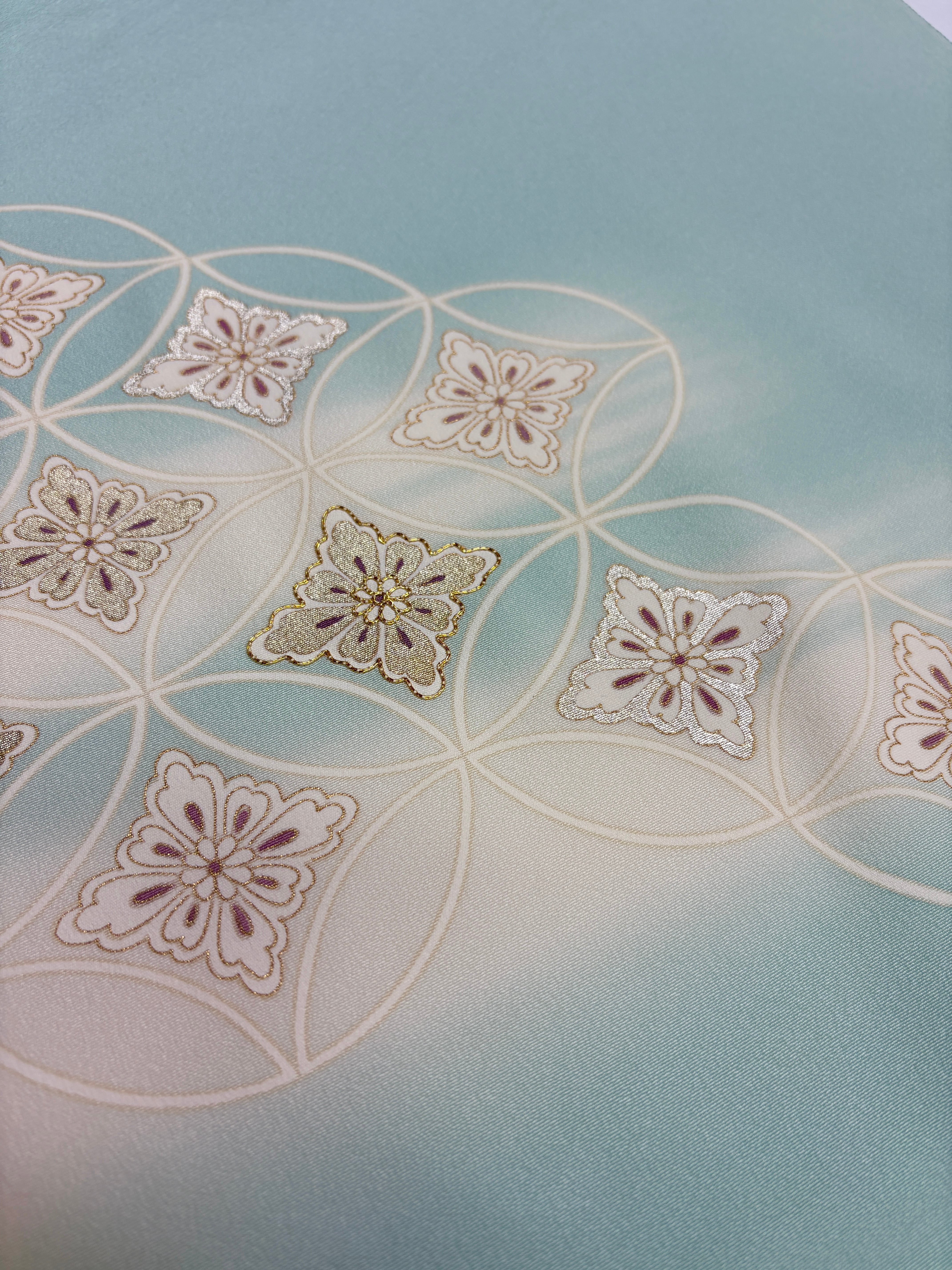 七宝の柄のなかに菊菱が描かれている、とても縁起の良い柄です。「円満」、「ご縁」、「長寿」、「繁栄」などの意味が込められております。お嬢様へのプレゼントにも最適です⋆˙⟡
