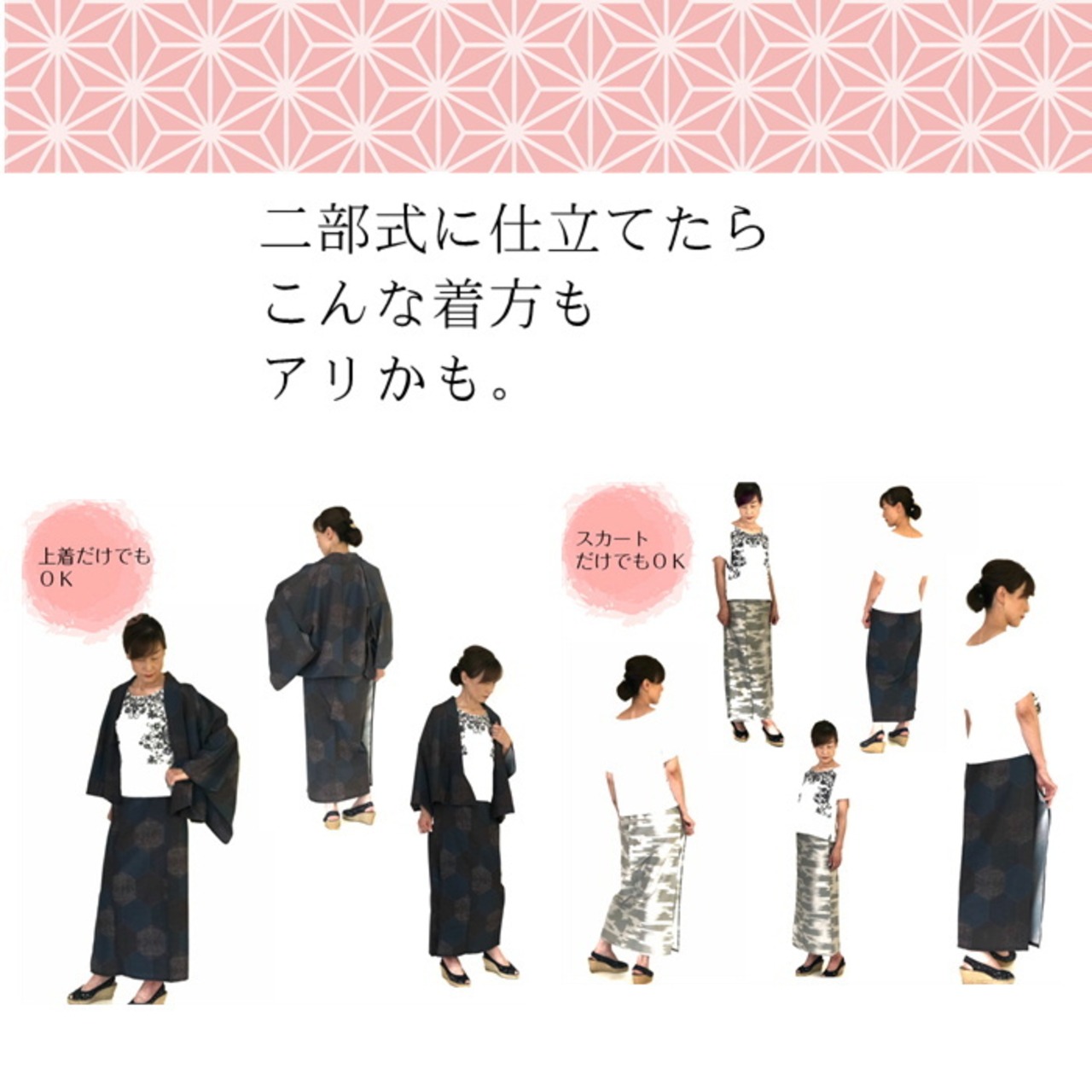 お手持ちの着物が生まれ変わる!《ゴムスカートタイプ セパレート 仕立て加工》のご紹介です。着物を簡単にセパレートスタイルに加工することで、快適な着用が可能です。お客様の着物をお送りいただくだけで、理想の形に仕立て直します!