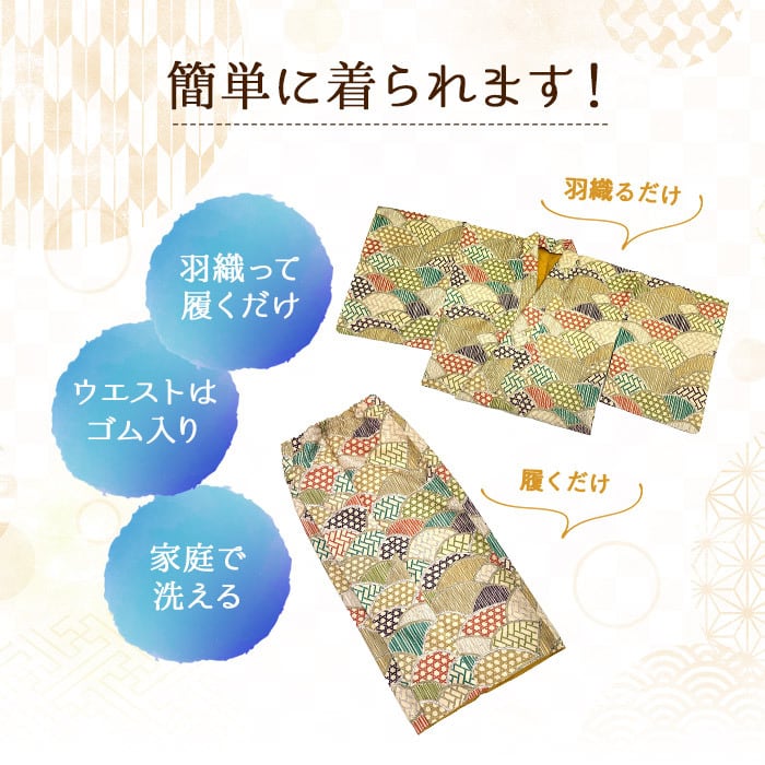 このゴムスカートタイプのセパレート着物は、海外へのお土産やプレゼントにも最適です。自分自身の特別なスタイルを楽しむほか、大切な方への贈り物としても喜ばれることでしょう。簡単で楽々な着付けスタイルで、さまざまなシーンを彩る一品をお楽しみいただけます。