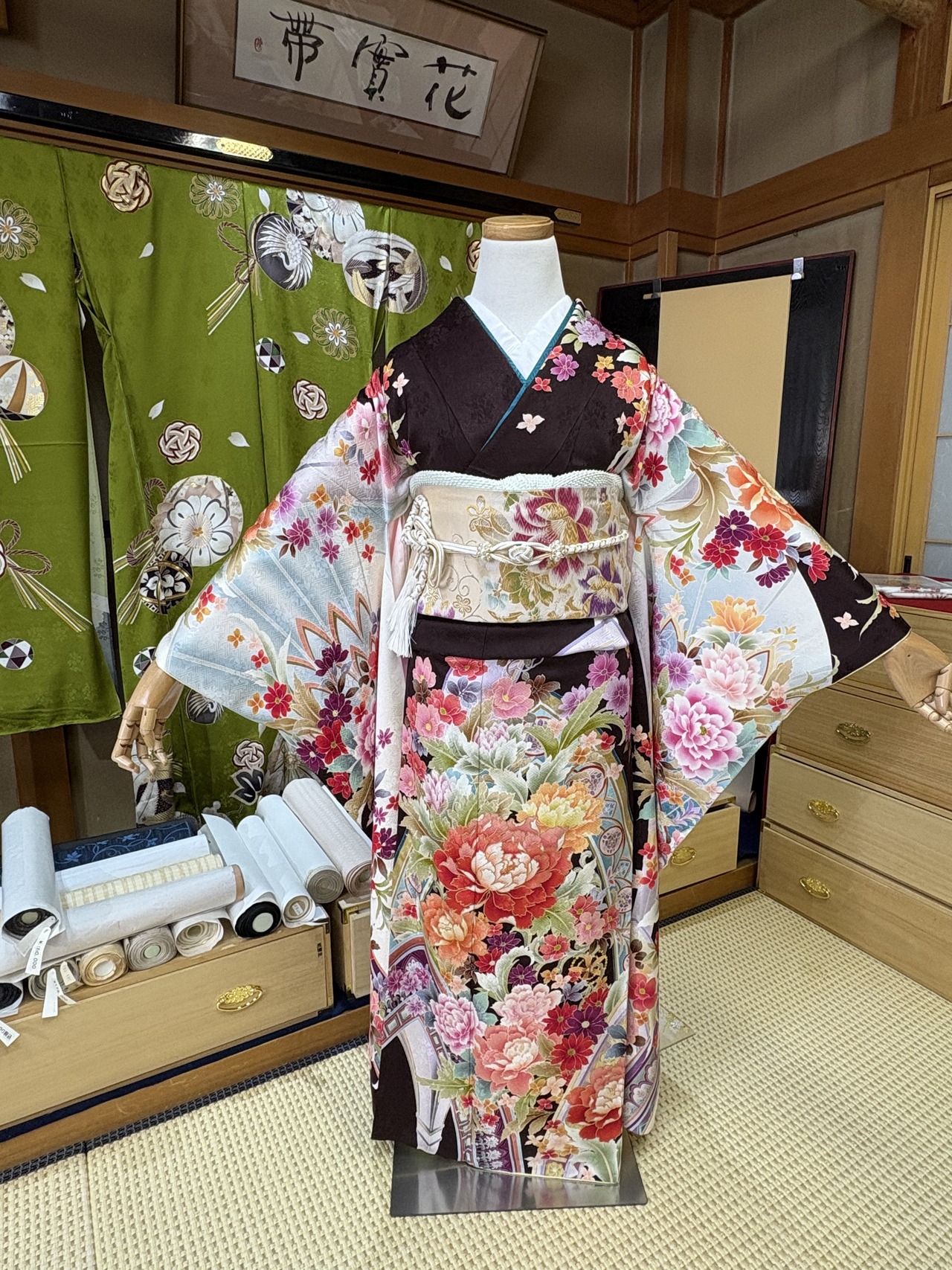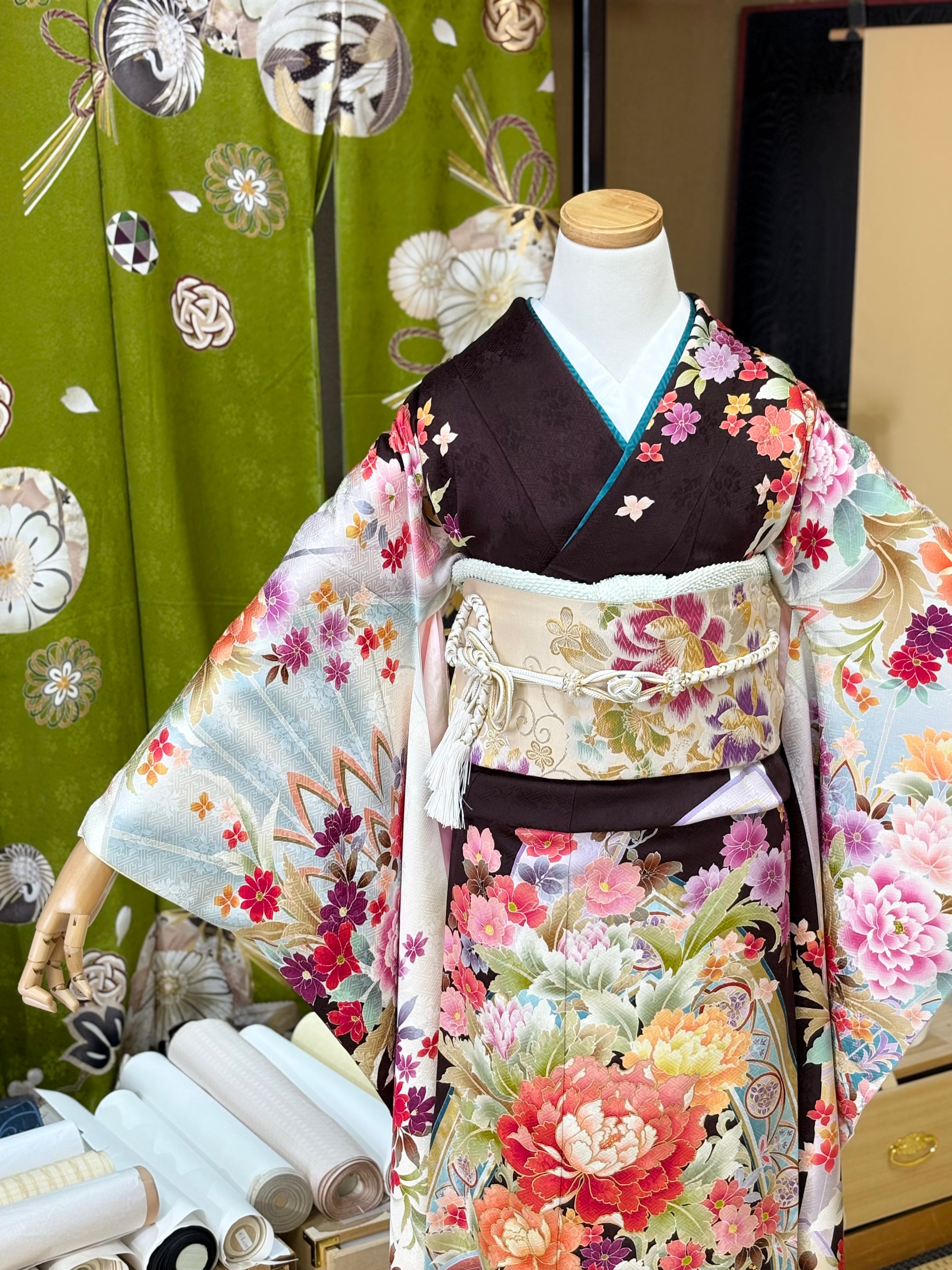 《振袖セットレンタル》ブラウン 花柄 成人式 結婚式お呼ばれ 帯 帯締め 伊達衿 帯揚げ 草履 バック 着付け小物