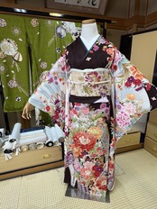 高品質な素材を使用した正絹の振袖は、豪華なデザインと美しさを兼ね備えています。模様が美しく、どんなシーンでも存在感を発揮します。また、着付け小物も一式揃っているので、美容室などに持っていく際にも安心です。